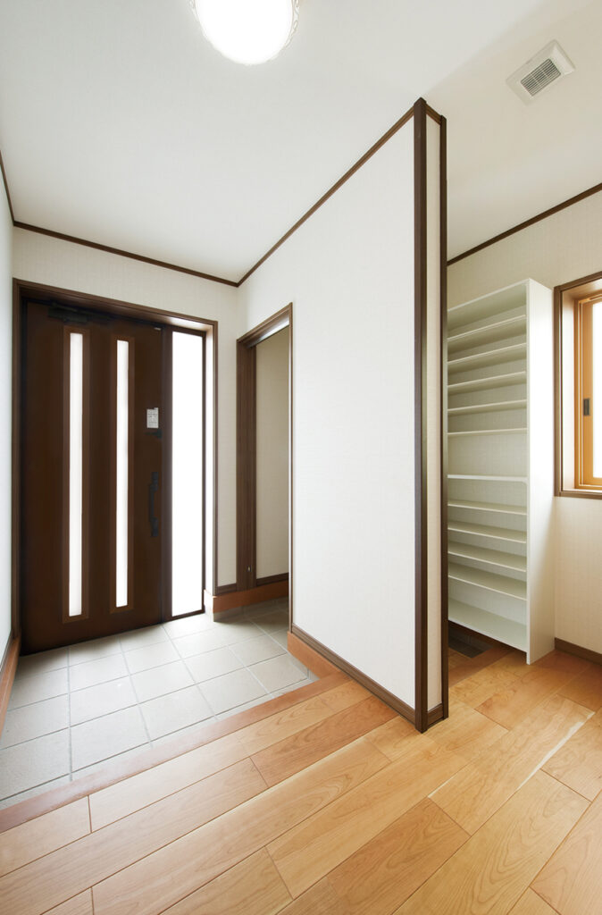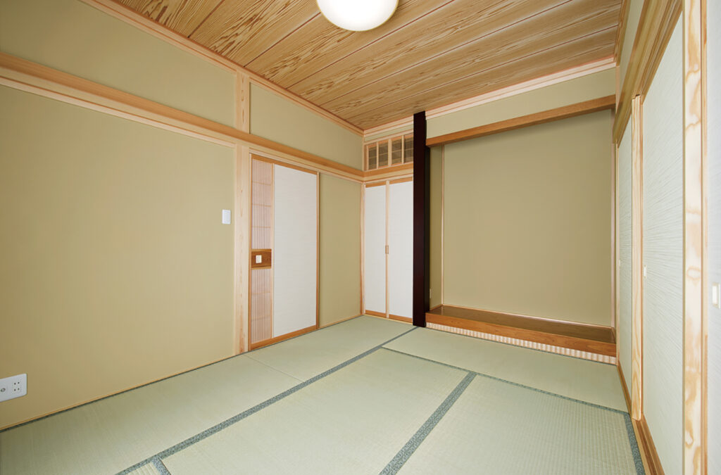 ご主人の実家も当社が手がけさせていただきました。「住み心地の良さや手厚い対応に幼い頃から接しており、マイホームは大富建設さんにと考えていました」とご主人様。ご結婚を機に家づくりを決意したご夫妻の要望は「余裕を実感しながら暮らせる家」。その思いに応えるべく、開放感あふれる25帖のLDKを創出。この大空間の床を美しく彩るのは、さくらを材質としたフローリング。窓際には、造作のカウンター収納を設置して収納力を高めています。また、対面式のセミオープンキッチンも間口を広く設計。キャビネット収納や作業台、大型パントリーを設えることで、モノに占有されることのない、ゆとりと潤いに満ちたしなやかな暮らしを実現しました。そして、さらなる開放感に拍車をかけるのが6帖の和室。襖を全開すればLDKと一体化した奥行き感のある連続空間に。襖で仕切れば玄関側からも出入りできる客間として利用可能な多様性に優れた空間に仕上がっています。