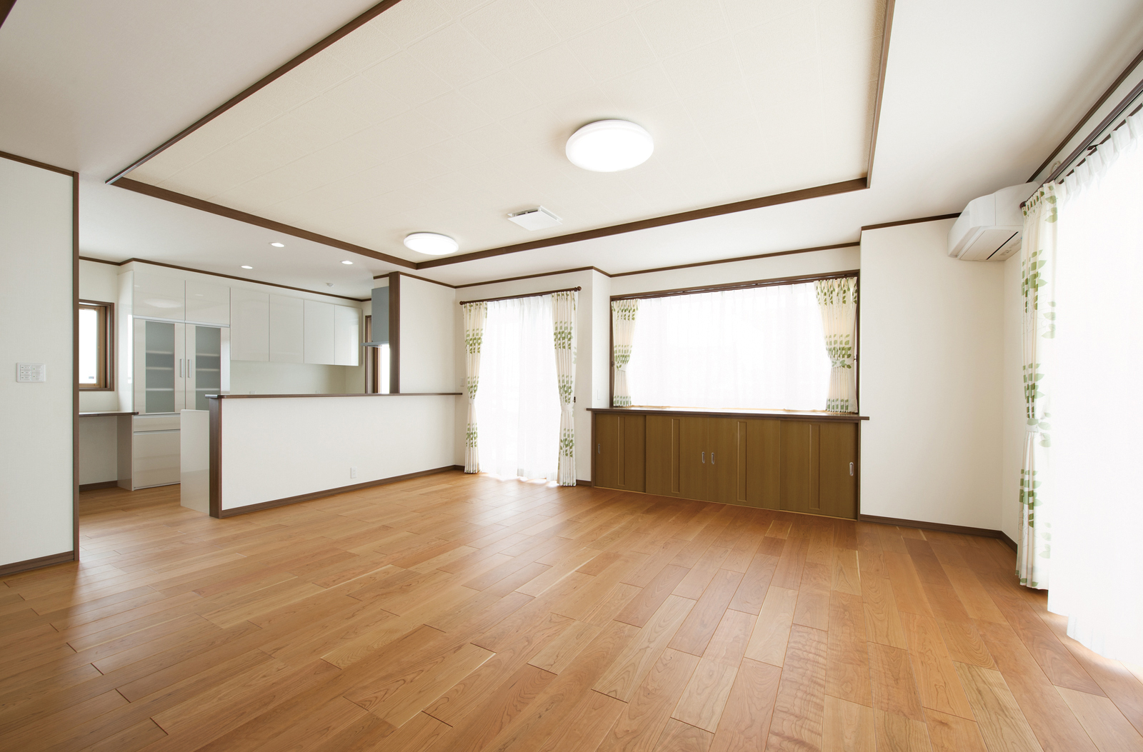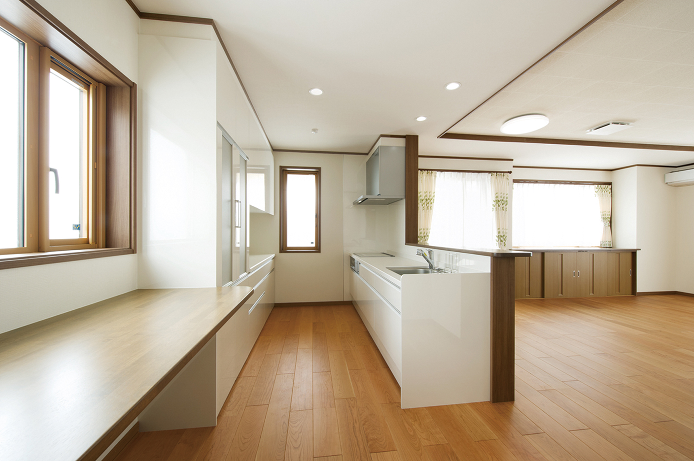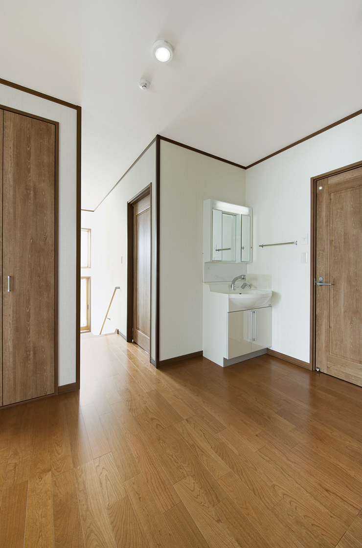 ご主人の実家も当社が手がけさせていただきました。「住み心地の良さや手厚い対応に幼い頃から接しており、マイホームは大富建設さんにと考えていました」とご主人様。ご結婚を機に家づくりを決意したご夫妻の要望は「余裕を実感しながら暮らせる家」。その思いに応えるべく、開放感あふれる25帖のLDKを創出。この大空間の床を美しく彩るのは、さくらを材質としたフローリング。窓際には、造作のカウンター収納を設置して収納力を高めています。また、対面式のセミオープンキッチンも間口を広く設計。キャビネット収納や作業台、大型パントリーを設えることで、モノに占有されることのない、ゆとりと潤いに満ちたしなやかな暮らしを実現しました。そして、さらなる開放感に拍車をかけるのが6帖の和室。襖を全開すればLDKと一体化した奥行き感のある連続空間に。襖で仕切れば玄関側からも出入りできる客間として利用可能な多様性に優れた空間に仕上がっています。