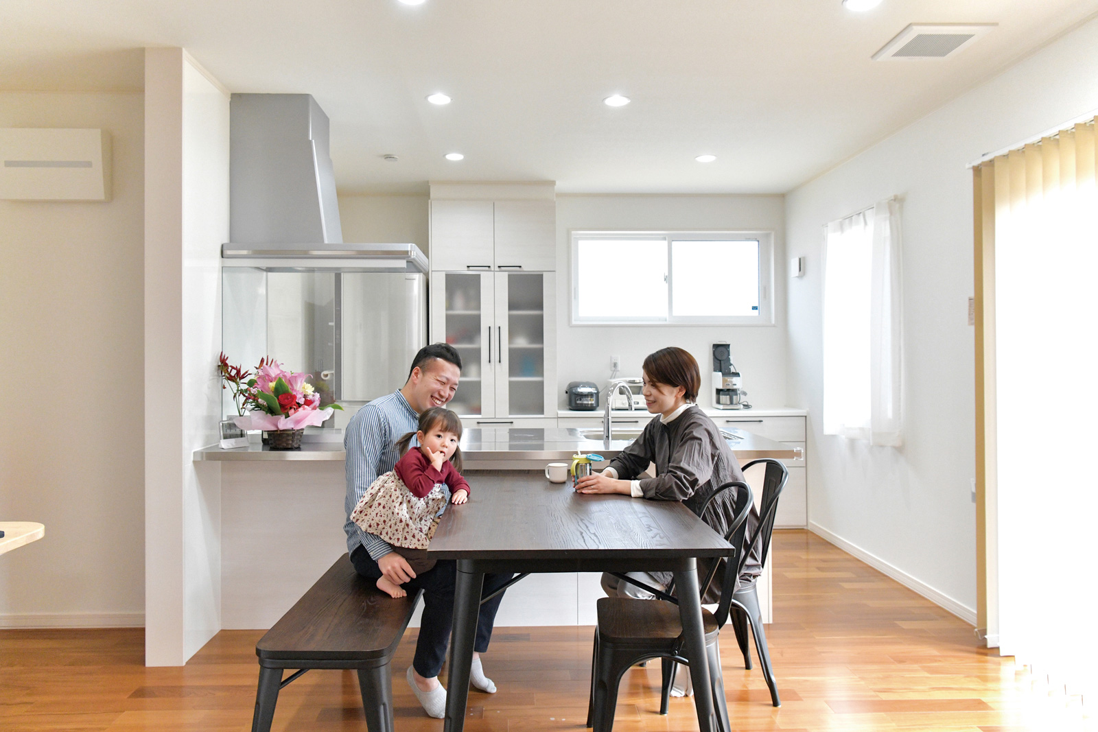 お子さんの誕生を機に将来、子どもが帰って来られる家をつくろうとマイホーム計画を本格化させたいというご夫婦。家づくりに関して二人でいろいろ勉強し、とことん話し合い、ご主人は主に間取りを、奥様は色使いを中心に家づくりをスタート。共通の憧れは吹き抜けのあるLDKと、生活動線を考えた回遊動線の水まわり。また「娘の雛人形を飾る和室は必ず欲しい」などの希望を間取りに落とし込みました。加えてご主人は「子どもに火の暖かさと怖さを教えたいから、暖房は炎が見えるペレットストーブを」と熱心にこだわりました。