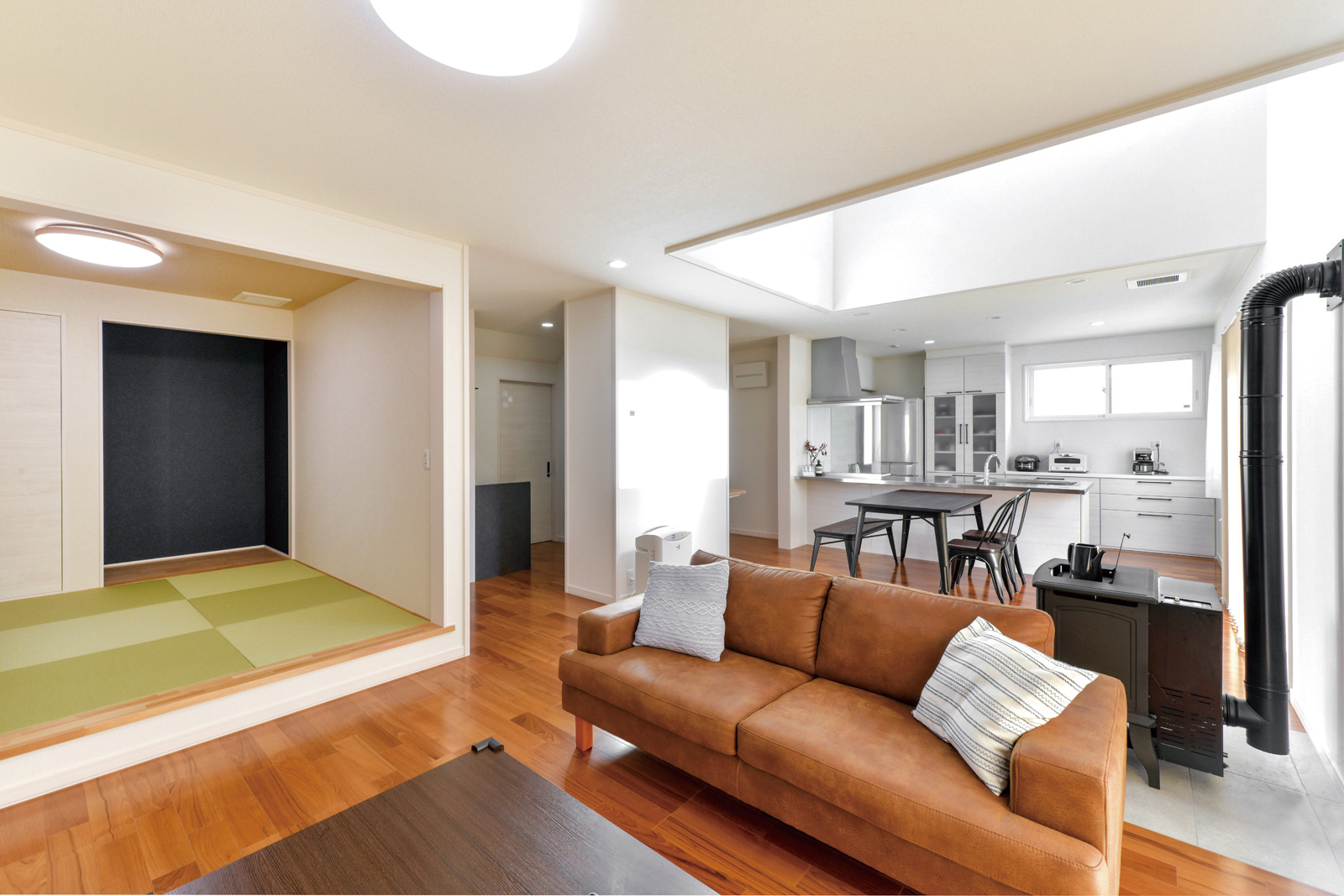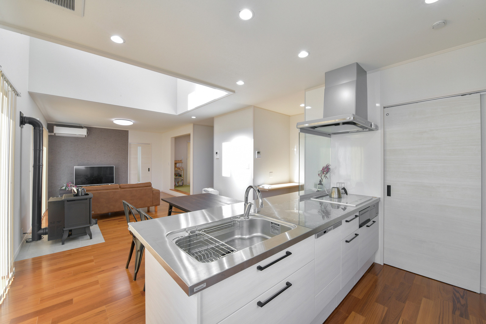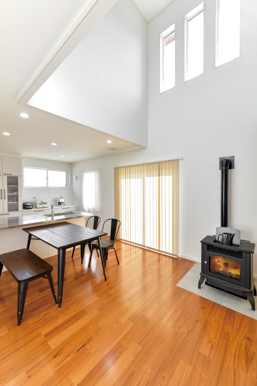 - 3連窓から光が降り注ぐ大きな吹き抜けにペレットストーブ。心から寛げるLDK。